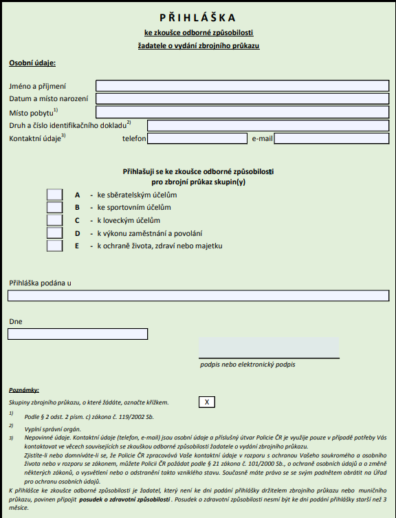 - Pokud máte místo pobytu v jiném členském státě EU, musíte přiložit souhlas tohoto státu s vydáním zbrojního průkazu nebo potvrzení, že souhlas není nutný.